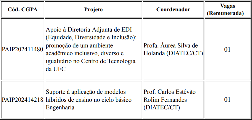O Departamento de Integração Acadêmica e Tecnológica em Engenharia (DIATEC) do Centro de Tecnologia (CT) da Universidade Federal do Ceará (UFC), no uso de suas atribuições legais, comunica que: estarão abertas as inscrições para seleção de BOLSISTA DO PROGRAMA DE ACOLHIMENTO E INCENTIVO À PERMANÊNCIA – PAIP, no período de 19 a 29 de Fevereiro de 2024, visando ao preenchimento de 02 vagas remuneradas, referentes ao edital de número 38/2023/CAD/PROGRAD, a atuar no projeto abaixo relacionados: