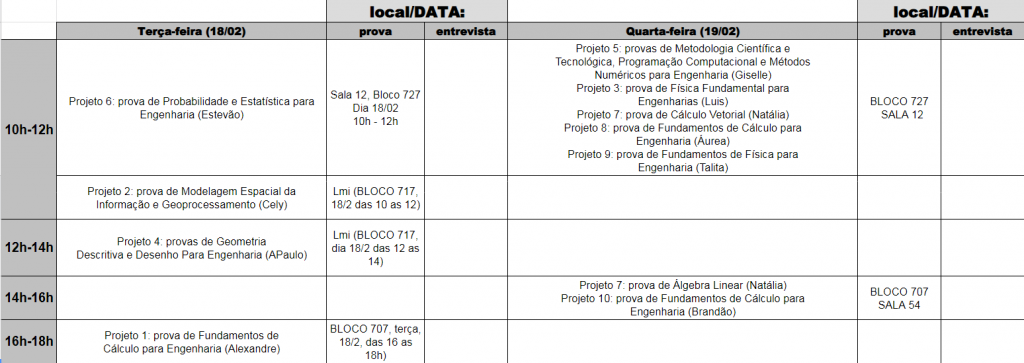 Obs2.: A sala para o projeto 1, é a sala 14, bloco 707.